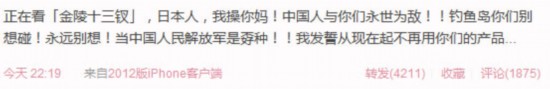 2011年12月29日晚,国内著名歌手韩红通过网络,称其正在观看张艺谋导演的电影《金陵十三钗》,字里行间难掩激动情绪,并爆粗口痛骂日本兵,称将“与日本人永世为敌”和“拒绝使用日货”。韩红微博原文:正在看《金陵十三钗》,日本人,我操你妈!中国人与你们永世为敌!!钓鱼岛你们别想碰!永远别想!当中国人民解放军是孬种!!我发誓从现在起不再用你们的产品。。。